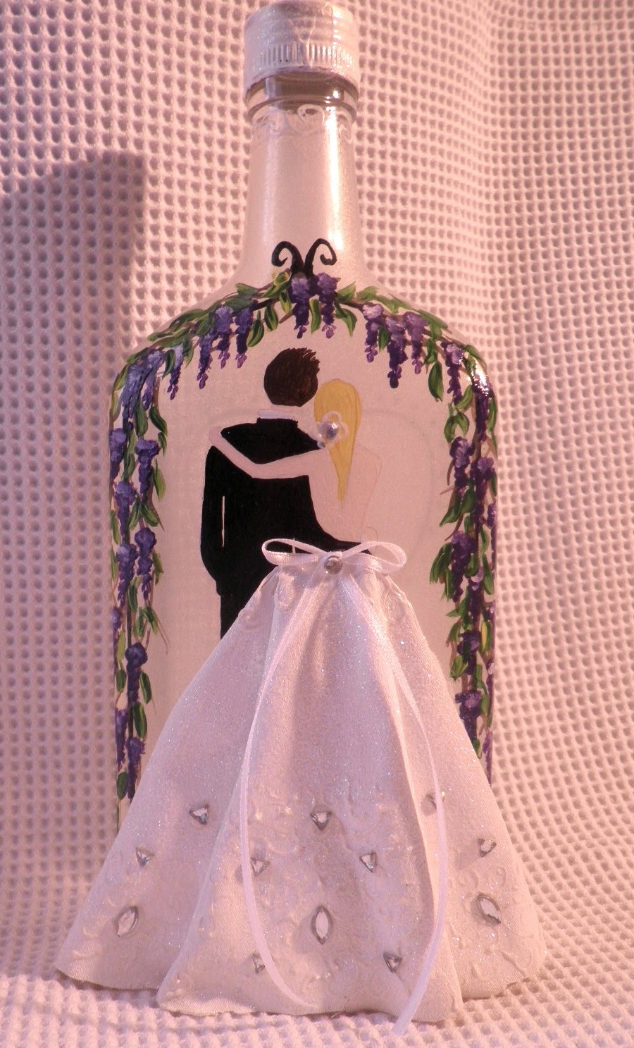 Bočice za svatove su slikane akrilnim bojama tehnikom dekorativnog slikanja. Detalji na leptiru su napravljeni sa srebrnim šljokicama.